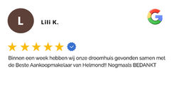 Mając ponad 20-letnie doświadczenie w regionie Eindhoven i Helmond, nadal jesteśmy znani jako jedna z najlepiej ocenianych i renomowanych agencji nieruchomości pod względem usług, jakości i wyników sprzedaży. Wszyscy nasi klienci są zadowoleni i polecają nas ponownie. Nie bez powodu nosimy ten tytuł...